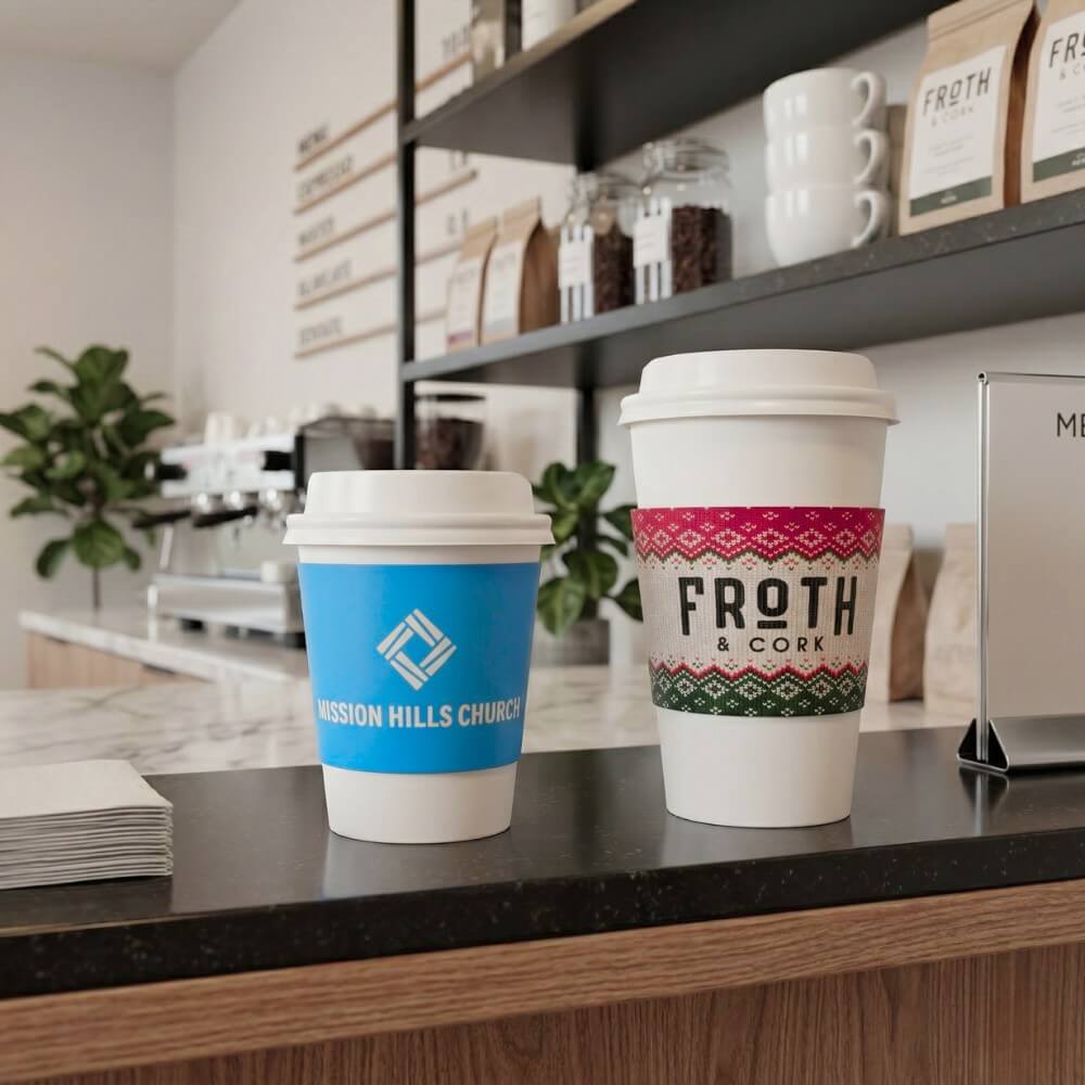 Premium custom coffee sleeves on takeaway paper cups with branded designs in cafe environment
