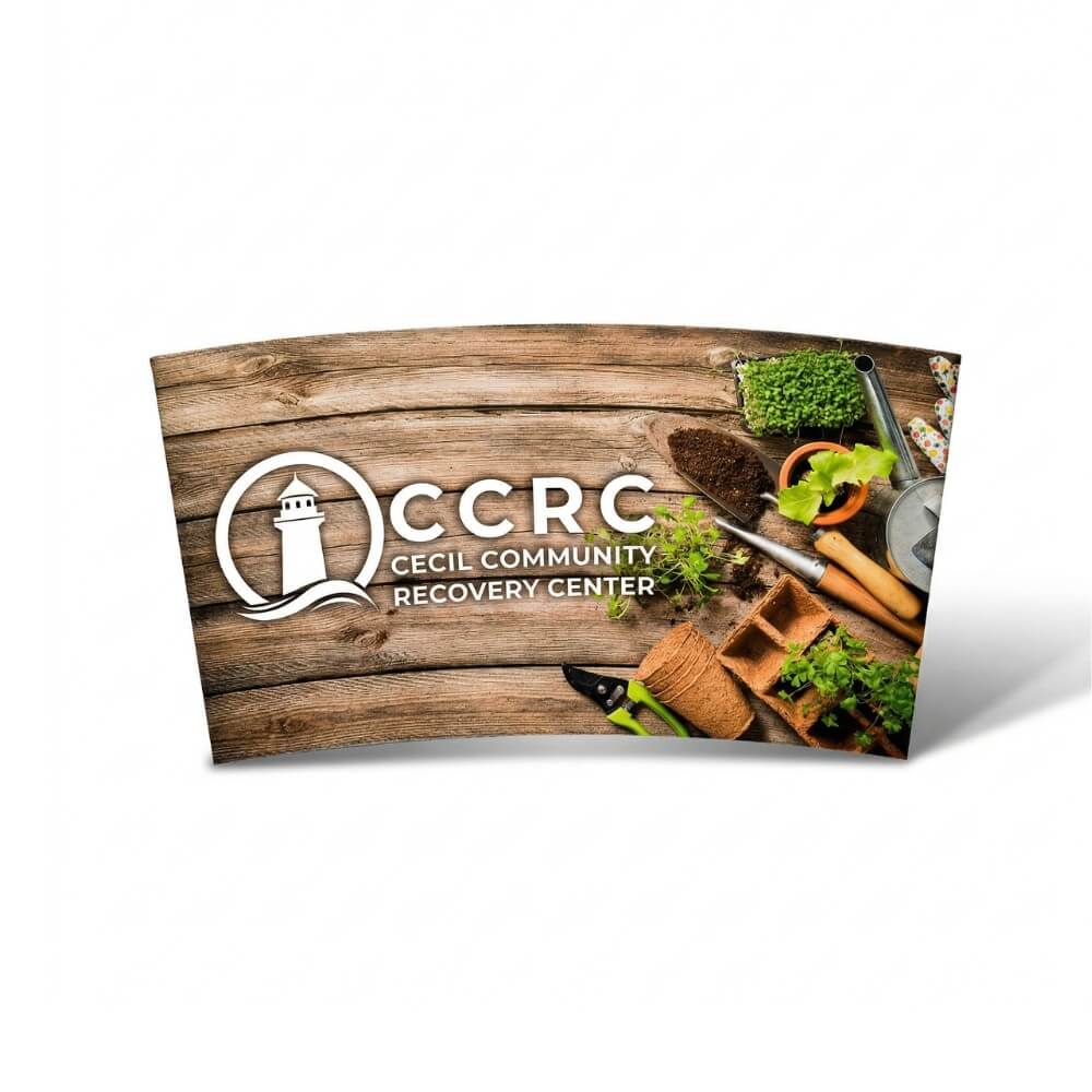 Premium full color printed coffee cup sleeve with custom CCRC logo and rustic wood design background