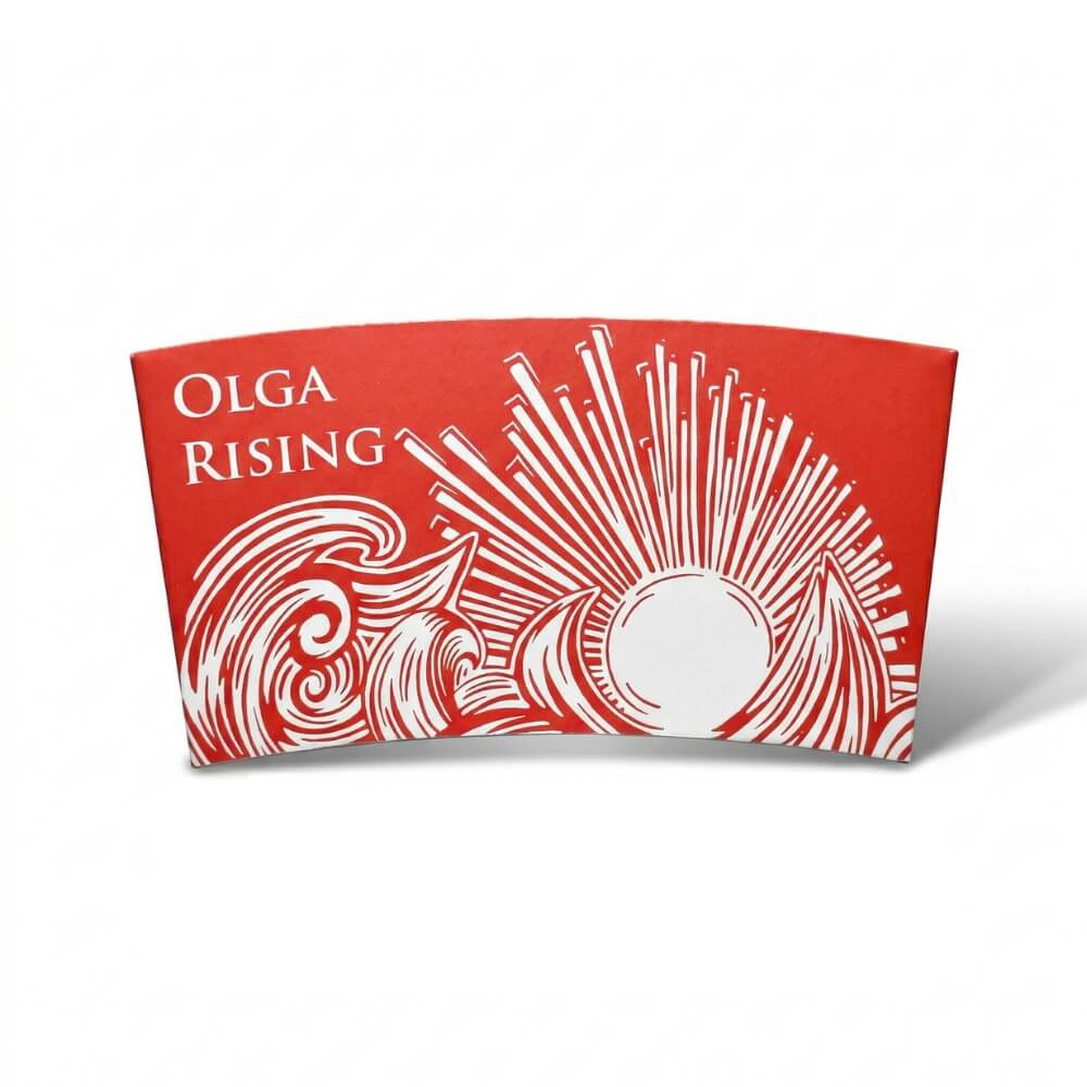 Premium red printed coffee cup sleeve with custom Olga Rising logo and artistic wave design