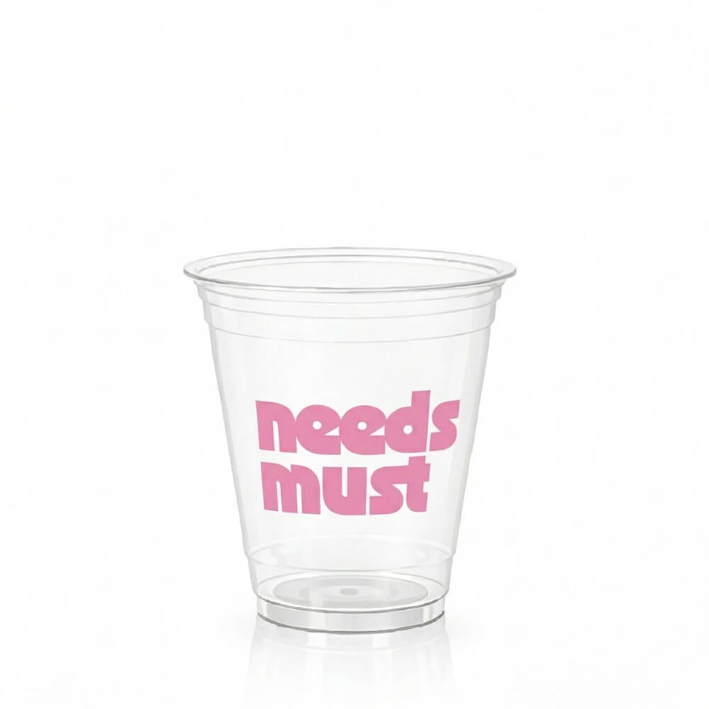 12oz clear plastic cup with pink needs must logo for cold drinks
