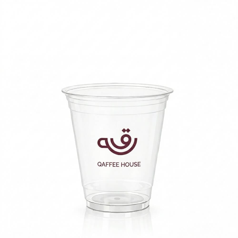 12oz clear plastic cup with minimalist logo design for cold beverages