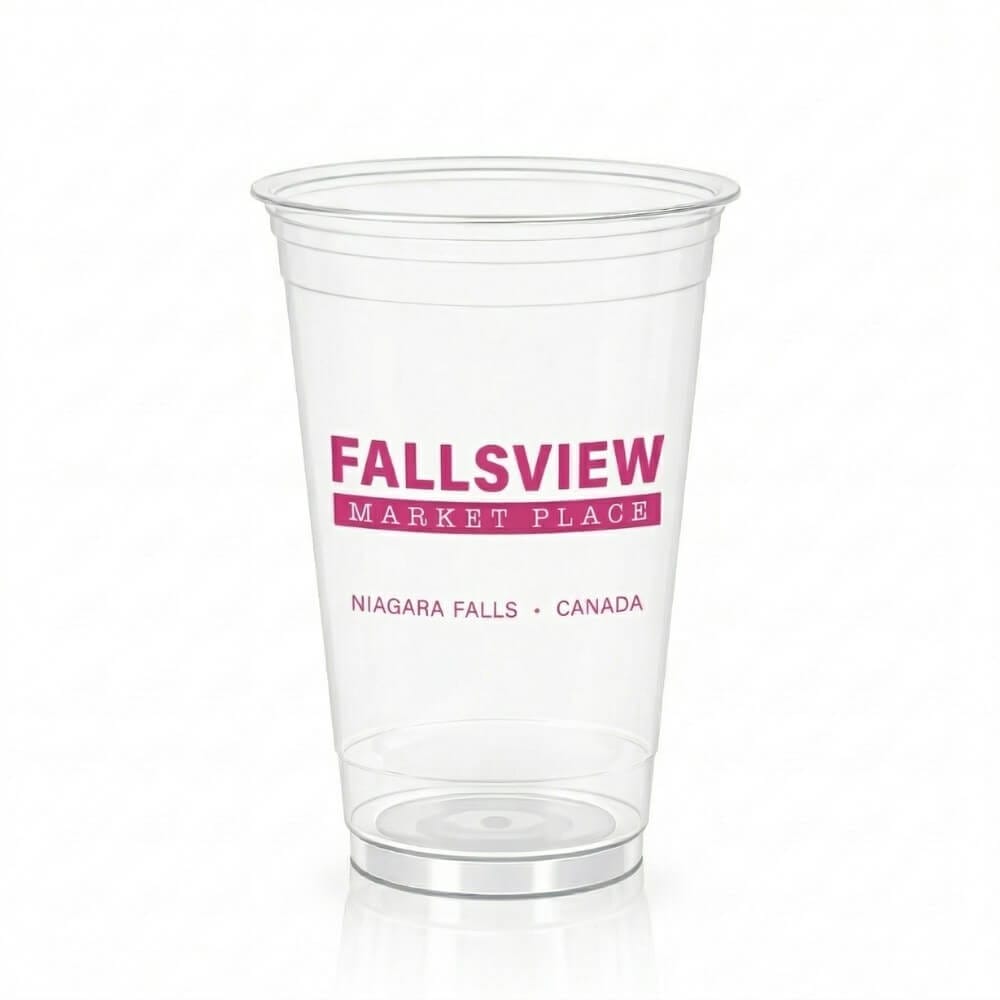 20oz clear plastic cup with Fallsview logo for cold beverages