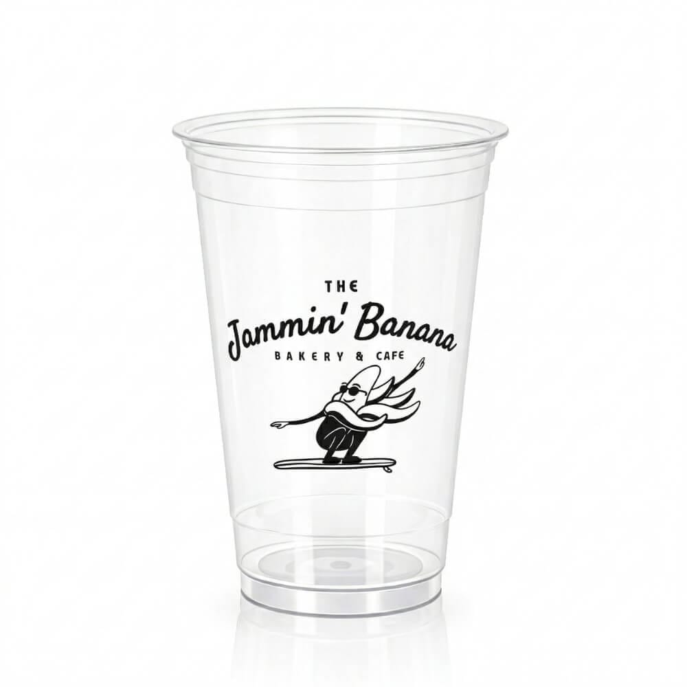 20oz clear plastic cup with Jammin Banana logo for cold beverages