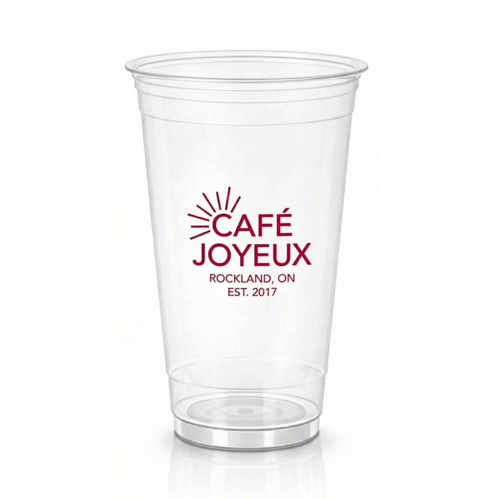 24oz clear plastic cup with Cafe Joyeux logo for cold beverages