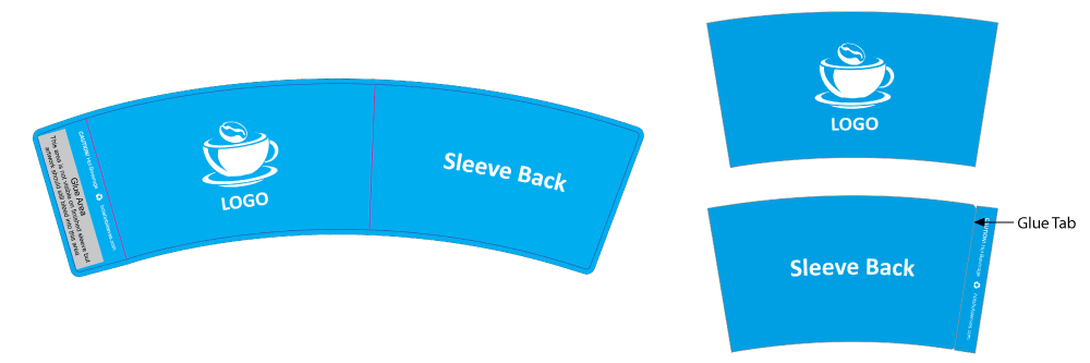 Standard sleeves are designed to wrap 12oz to 20oz single wall hot cups. When laid flat, sleeves measure approximately 9.5 inches in length and 2.5 inches in height. Once assembled, diameter ranges between 3.8 and 4.2 inches depending on cup taper. Templates are available for exact specifications.